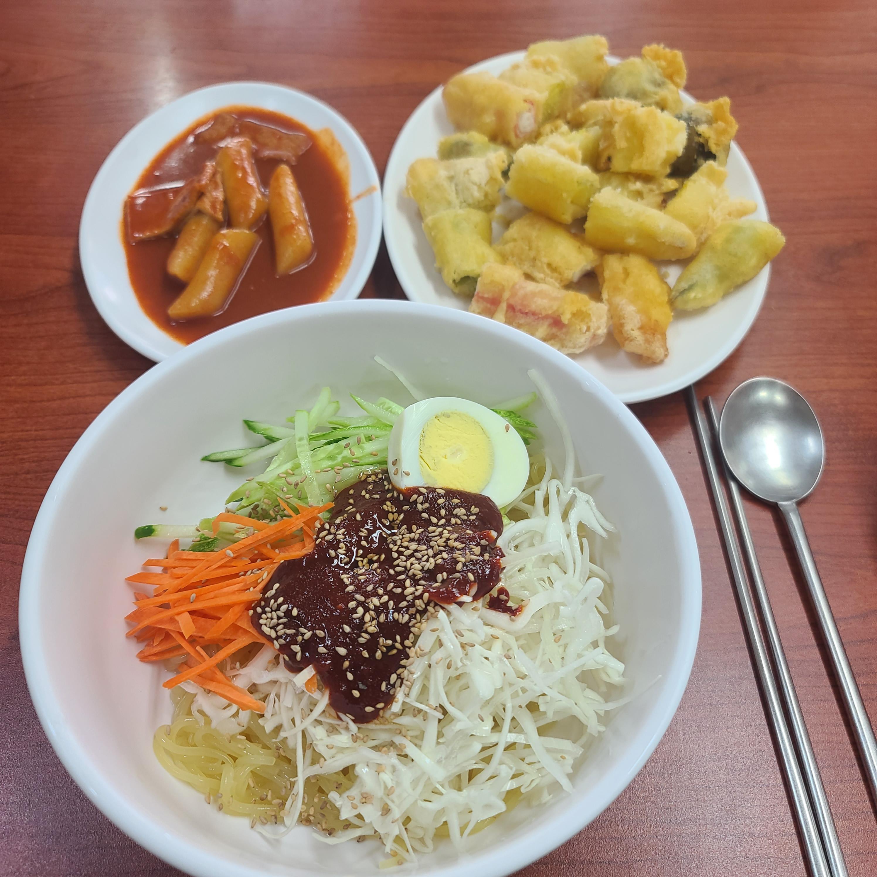 쫄면과 볶음면을 주문했습니다. 떡볶이를 찍어먹는 서비스로 떡볶이도 주셨어요.